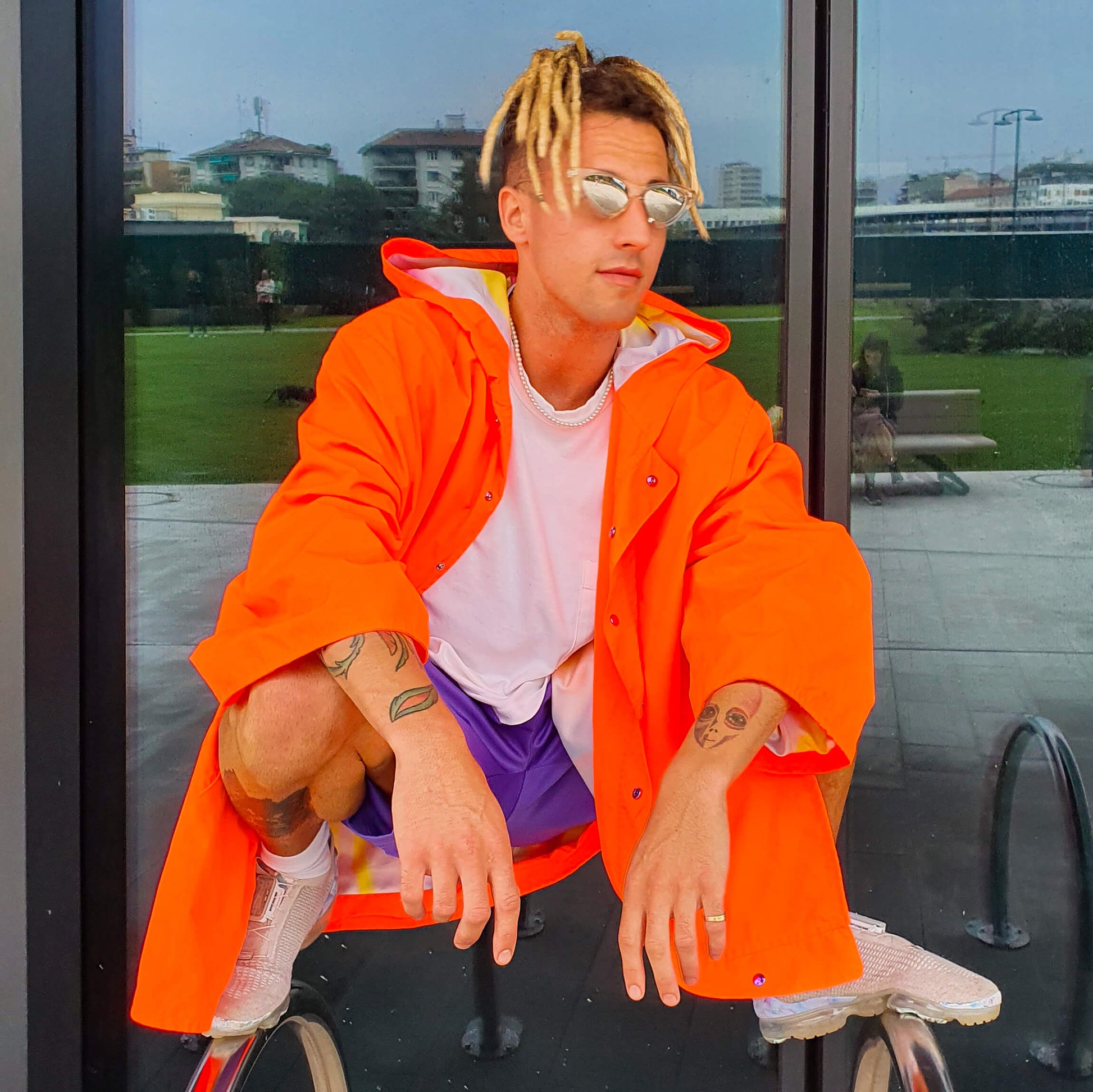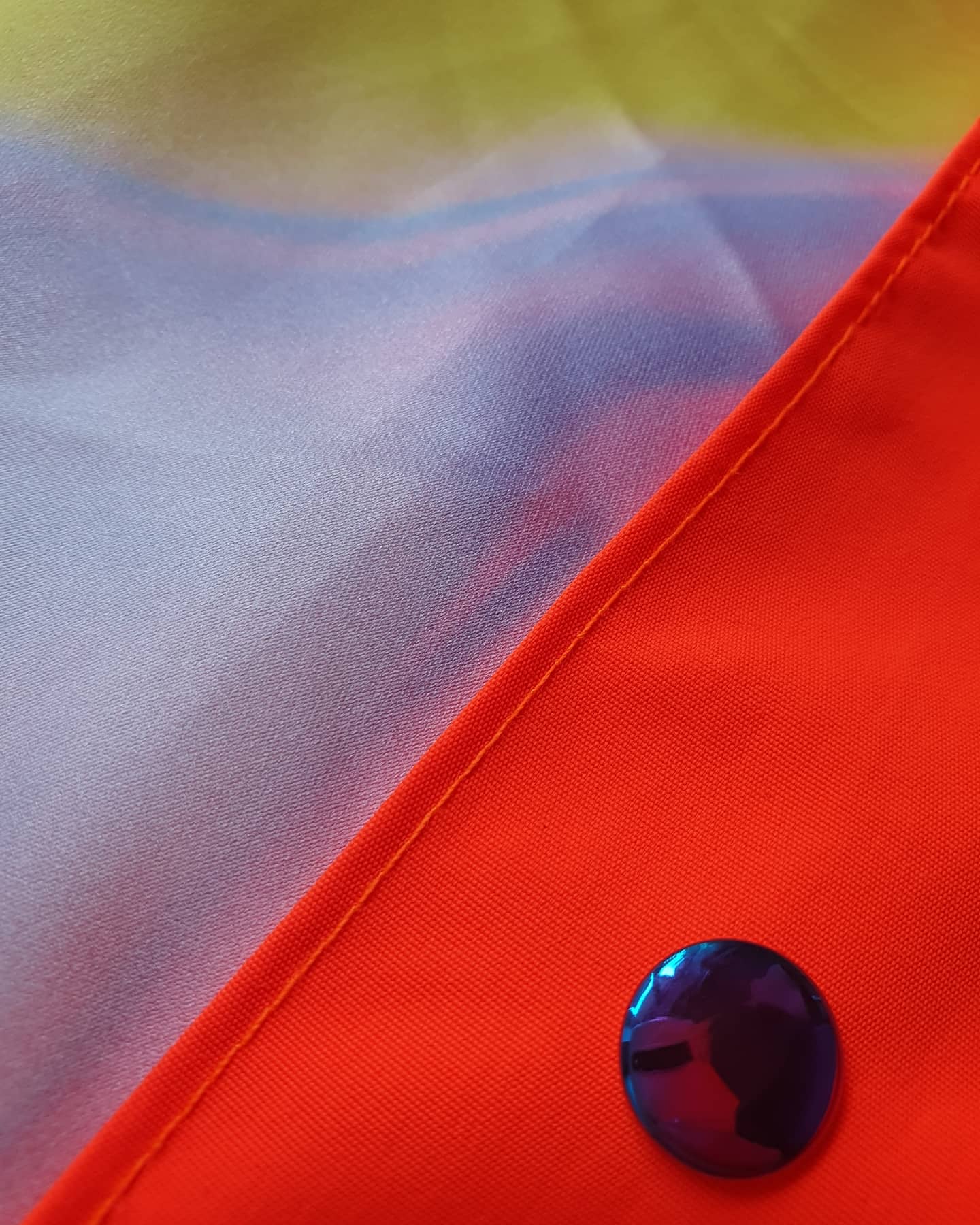 This oversized neon orange jacket radiates pure energy — designed for those who live vividly and walk their own orbit. Crafted from recycled nylon with a water-repellent coating, it keeps you dry while lighting up every street with color.
